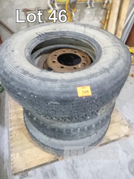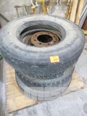 3 x STEEL TRUCK RIMS & 4 x TYRES, 9.00 R20 141/138L, 8 STUD