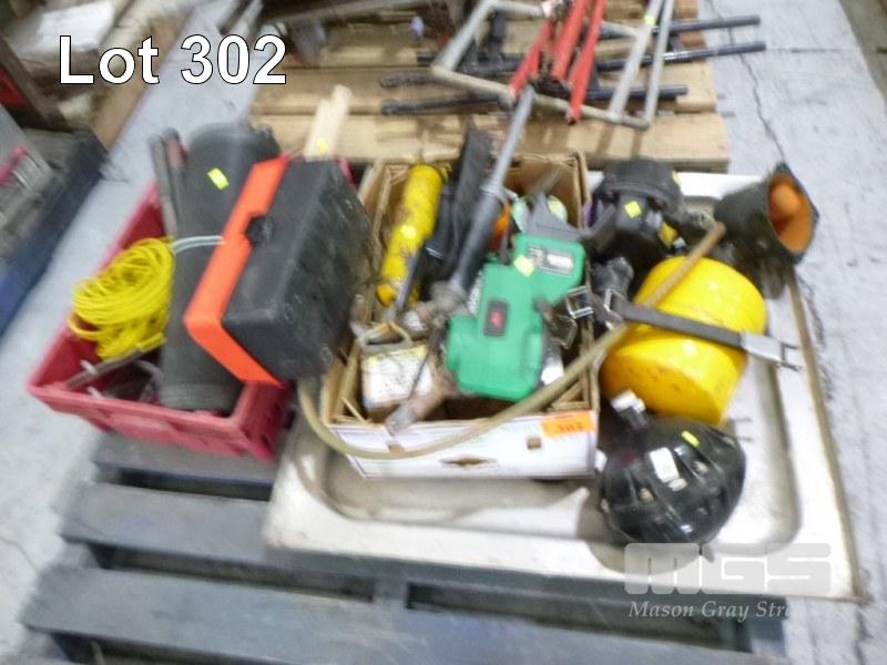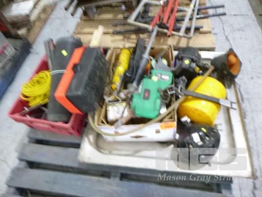 ASSORTED GARDENING TOOLS, GREASE GUN, DRUM PUMP, RIVETS, STAINLESS STEEL DRAIN PAN, PUMP PARTS & HAZARD LIGHTS, 1 x PALLET
