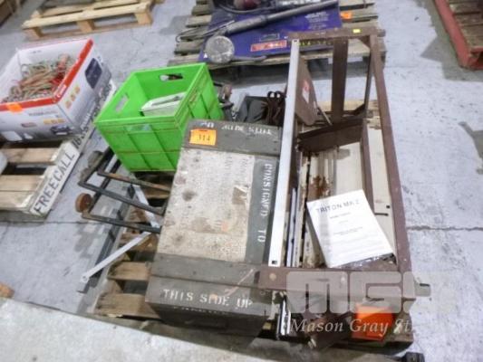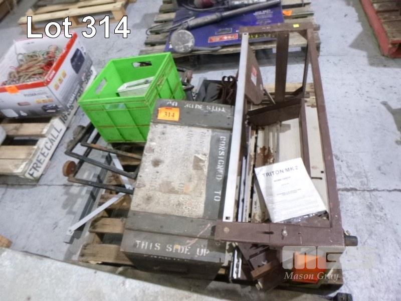 EARLY TRITON MK2 WORK CENTRE, TIMBER AMMO BOX & CONTENTS ASSORTED FASTENERS, HAND TOOLS, COBBLERS FORM, ETC