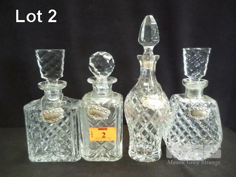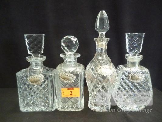 4 x CRYSTAL DECANTERS WITH STERLING SILVER TAGS, HALLMARKED