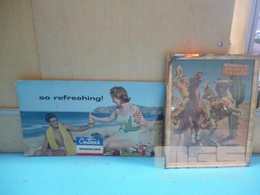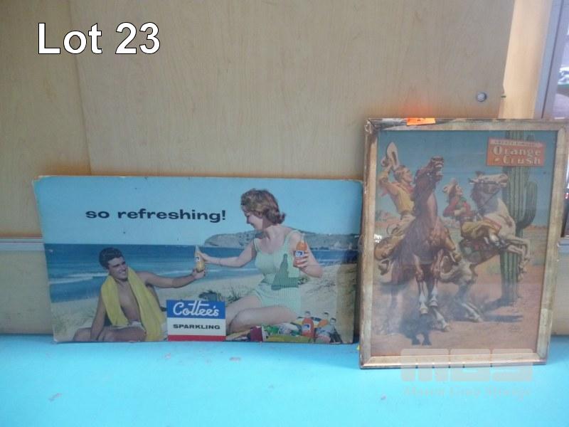 2 x VINTAGE CARDBOARD ADVERTISING SIGNS, COTTEES SPARKLING & ORANGE CRUSH