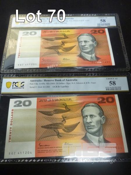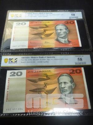 1985 2 x $20.00 NOTES CONSECUTIVE PCGS CHOICE AUNC