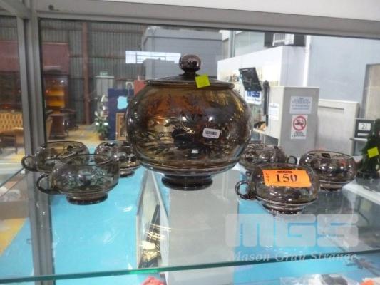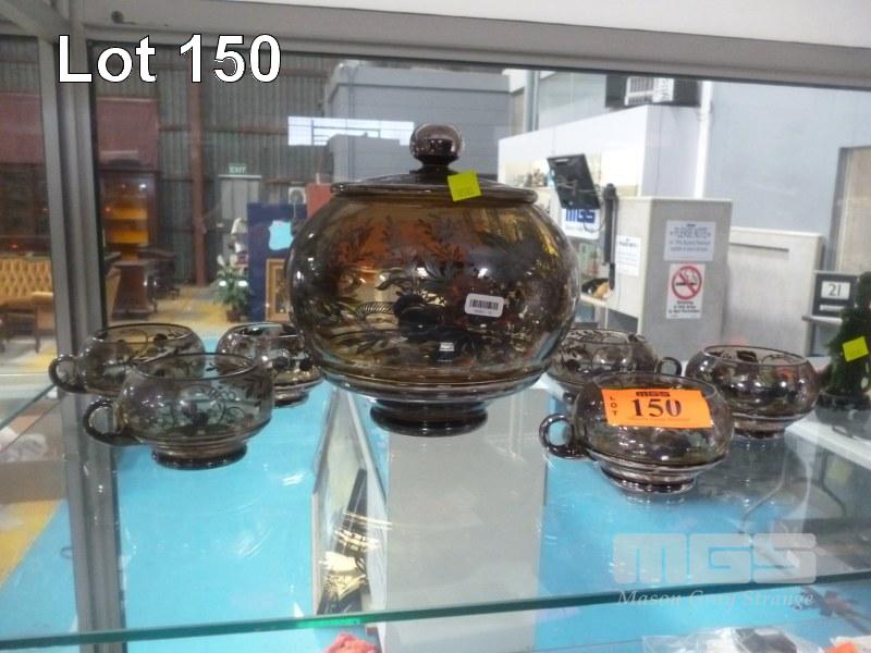SMOKE GLASS PUNCH BOWL SET, FLORAL LIDDED PUNCH BOWL & 6 x GLASSES