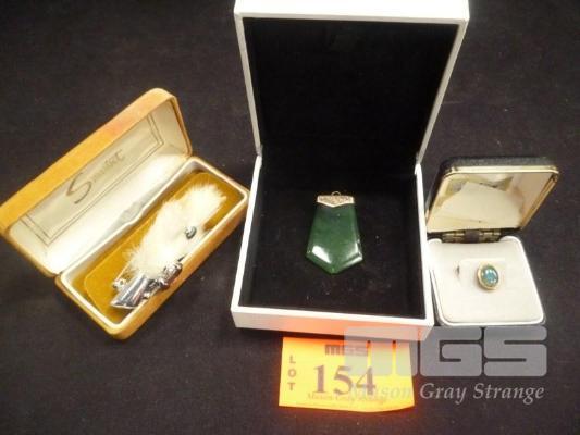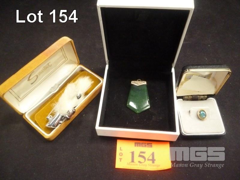 SCOTTISH RABBITS FOOT BROOCH, STAGE HEAD SET WITH PURPLE FACETED STONE, TIE PIN SET WITH OPAL TRIPLET & JADE PENDANT SET IN 9CT GOLD