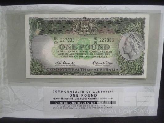 COMMONWEALTH OF AUSTRALIA, ONE POUND BANKNOTE IN COLLECTORS FOLDER, COOMBS/WILSON, HK26 227005 (CHOICE UNC)