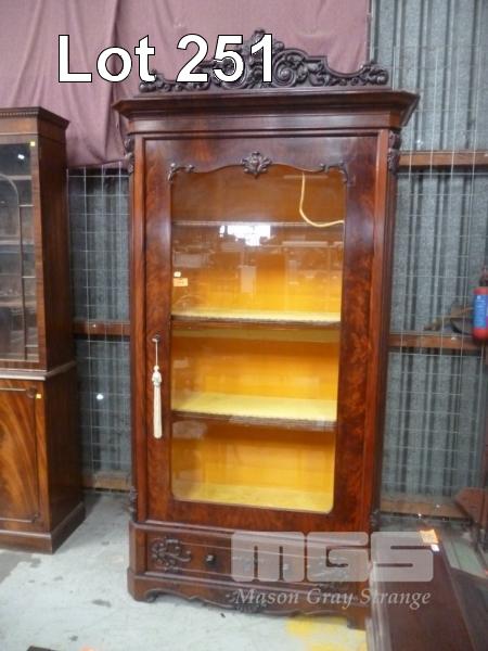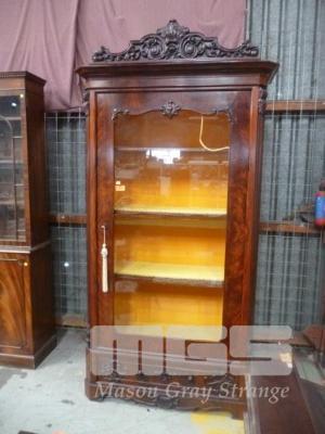 FLAME MAHOGANY ENCLOSED BOOKCASE, DECORATIVE CARVED, SINGLE DRAWER UNDERSTORAGE, GLASS FRONT WITH KEY