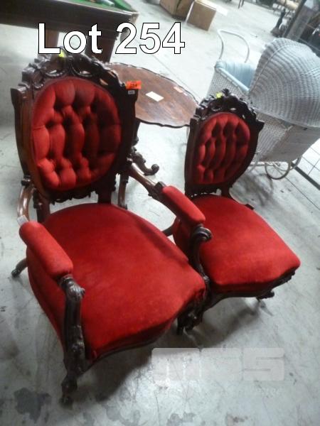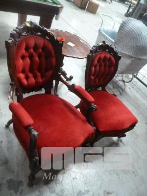 ORNATE CARVED, GRANDFATHER & GRANDMOTHER CHAIRS, RED VELVET