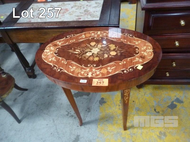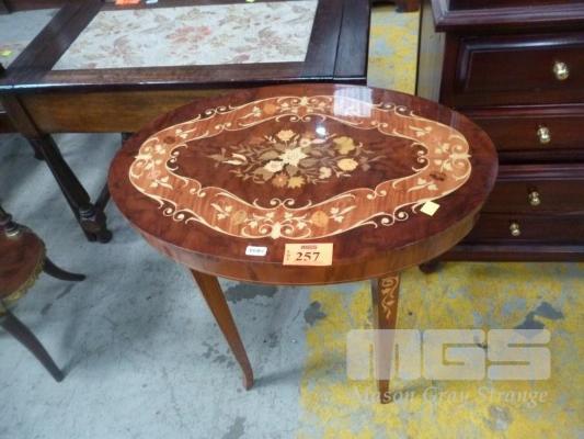 ORNATE TIMBER MUSICAL OVAL OCCASIONAL TABLE, DECORATIVE MARQUETRY INLAY