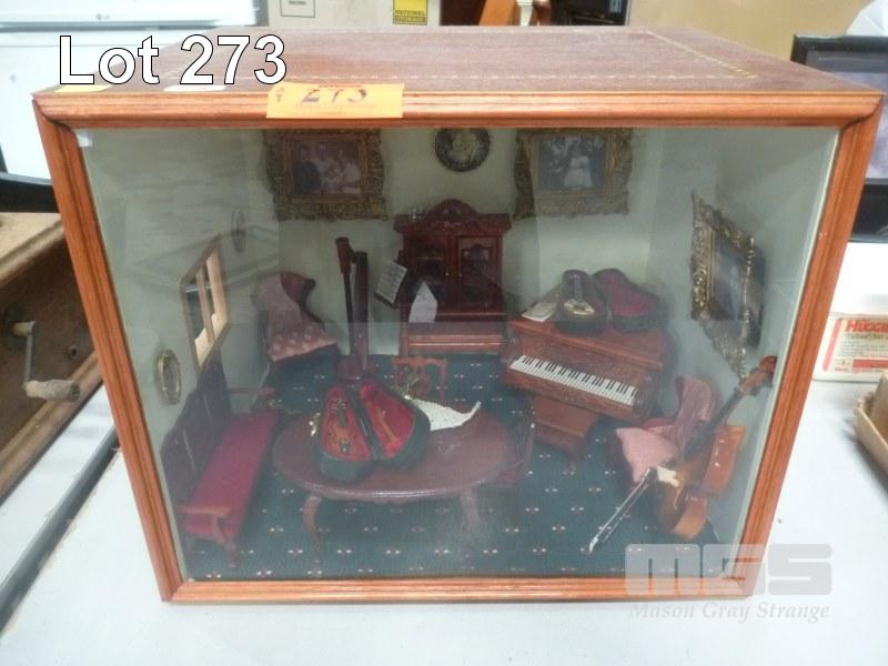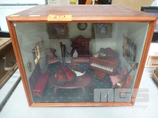 ENCASED OLD WORLD LIVING ROOM DIORAMA IN MARQUETRY DISPLAY BOX
