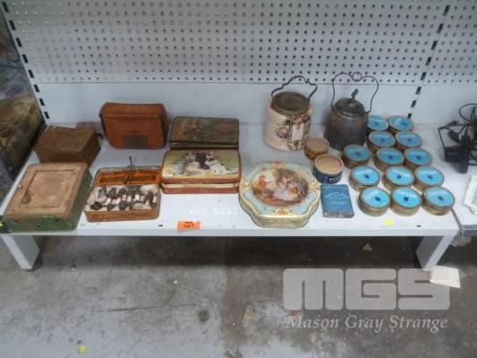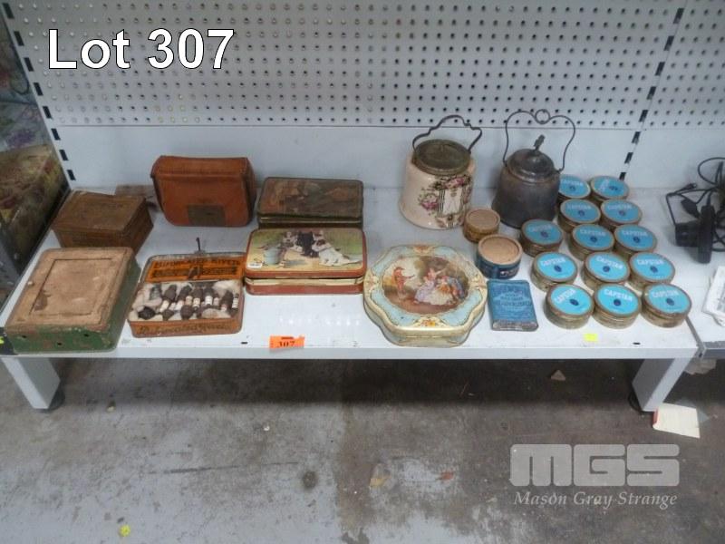 ASSORTED VINTAGE TINS, PARK PLUGS & POTS