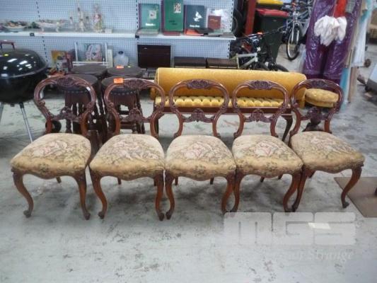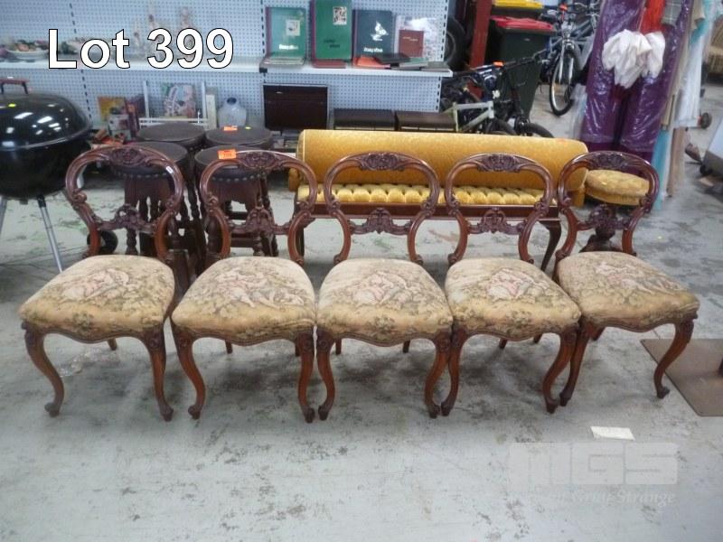 SET 5 TIMBER FRAMED DINING CHAIRS, ORNATE CARVED, BALLOON BACK TAPESTRY UPHOLSTERED