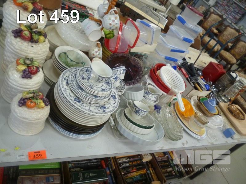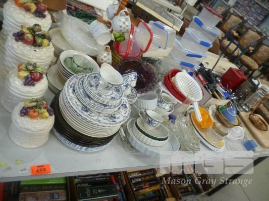 ASSORTED DINNERWARE, UTENSILS, CUTLERY, STORAGE CONTAINERS, ETC, 1 x TABLE