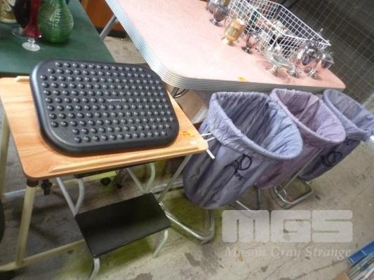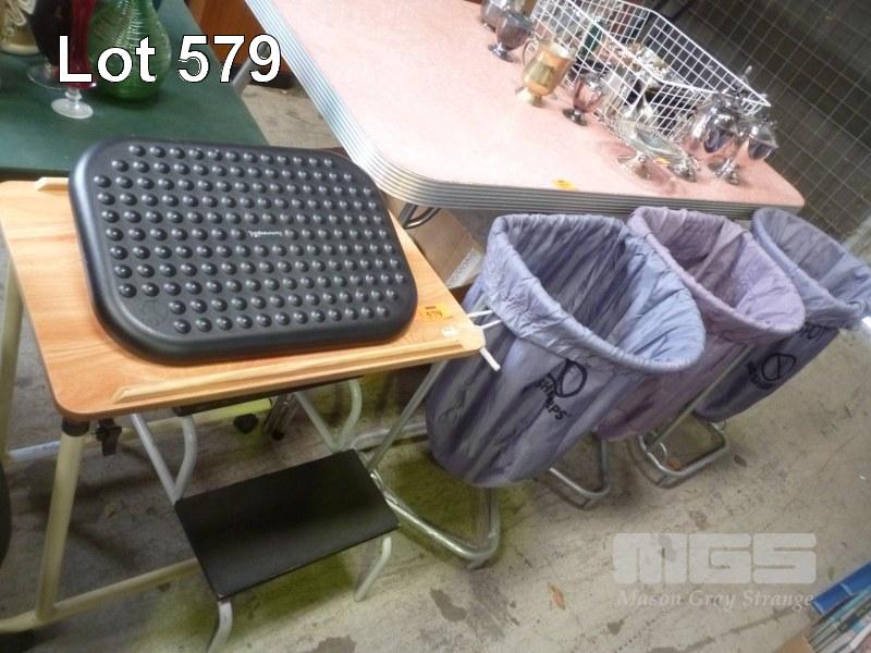3 x STEEL FRAMED SCRUBS BINS, OVERWAY TABLE & STEPS