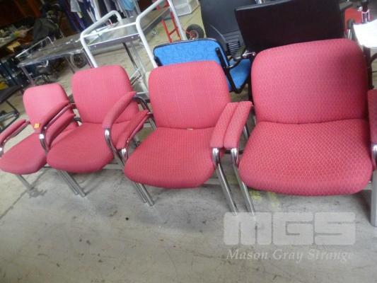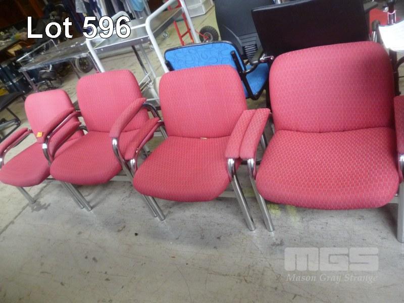 SET 4 CHROME FRAMED RED FABRIC UPHOLSTERED VISITORS CHAIRS, (1 x TALLER)
