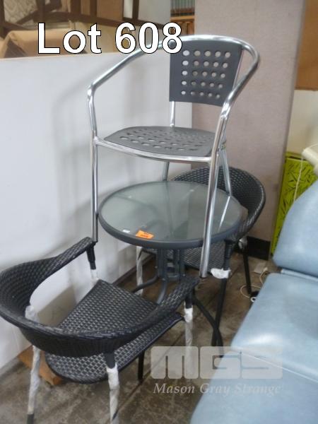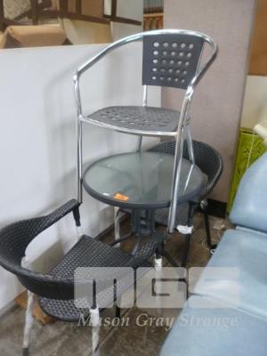 PATIO SETTING, CIRCULAR GLASS TOP TABLE WITH 2 x WOVEN CHAIRS & 1 x OTHER