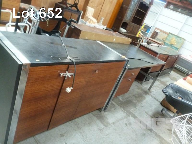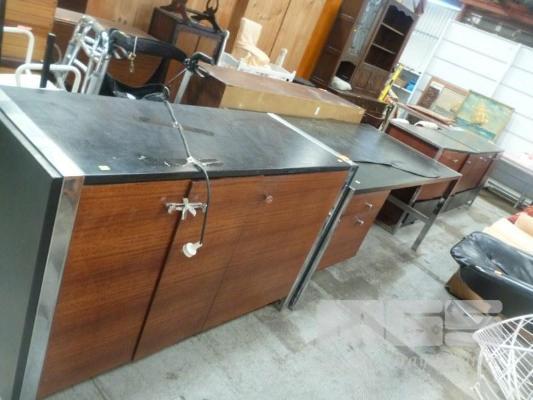 RETRO 5 PIECE OFFICE SUITE, CHROME FRAME, BLACK VINYL, TIMBER VENEER, INCLUDING DESK, EXECUTIVE CHAIR, 3 DOOR CABINET WITH INBUILT UNDERBAR FRIDGE & 2 x 3 DOOR/DRAWER CABINETS