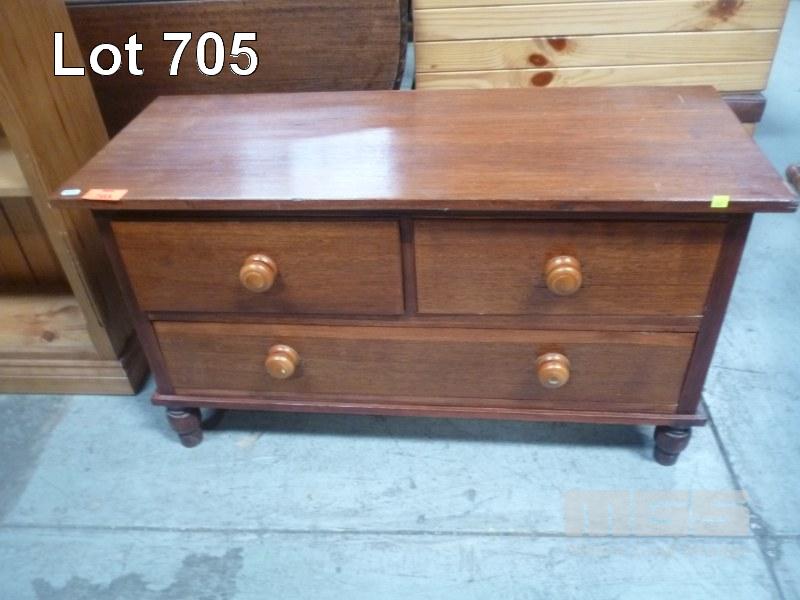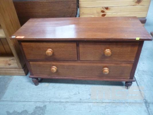 TIMBER LOWLINE 3 DRAWER CABINET, (1 x LEG MISSING)