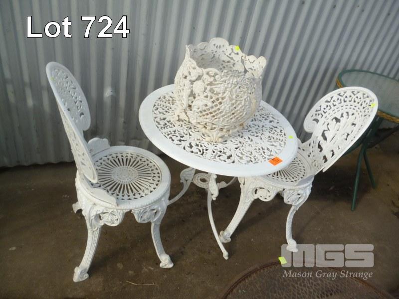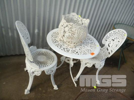 CAST ALUMINIUM 3 PIECE OUTDOOR SETTING, ROUND TABLE & 2 x CHAIRS WITH POT HOLDER