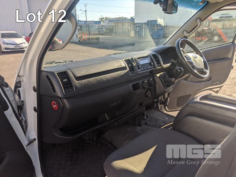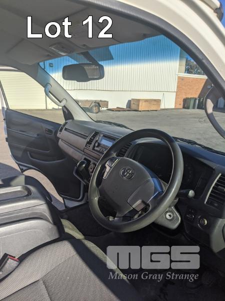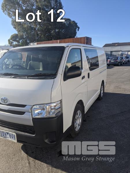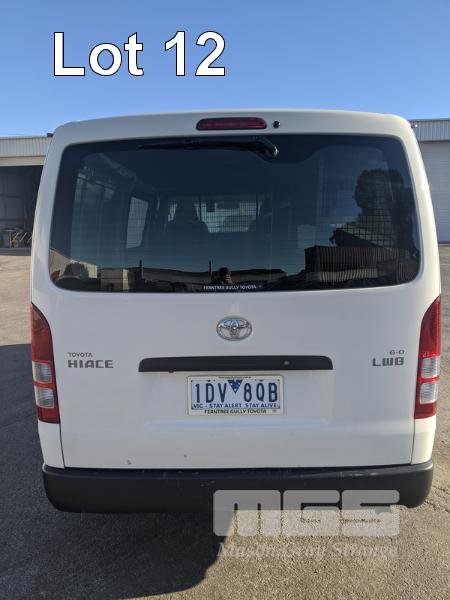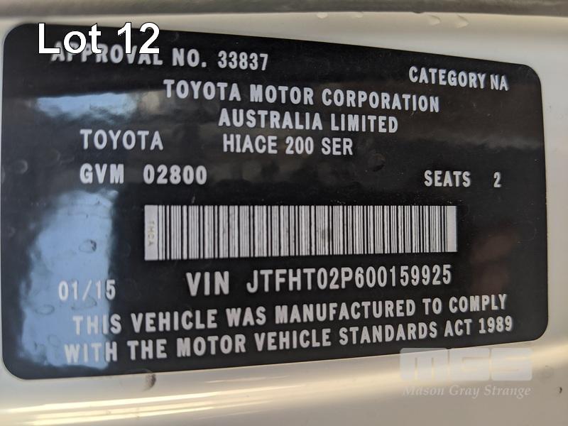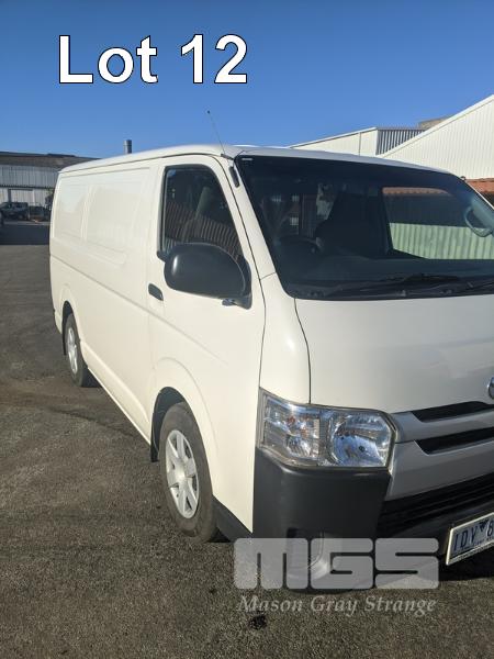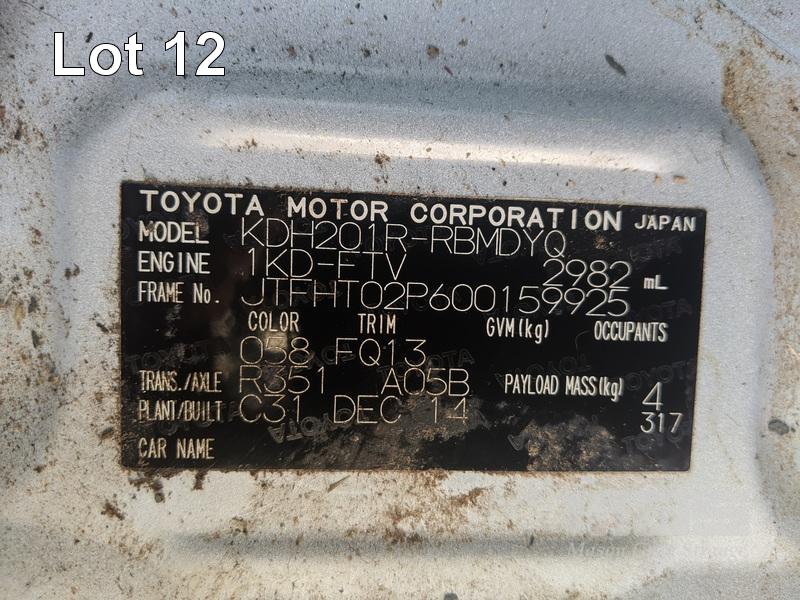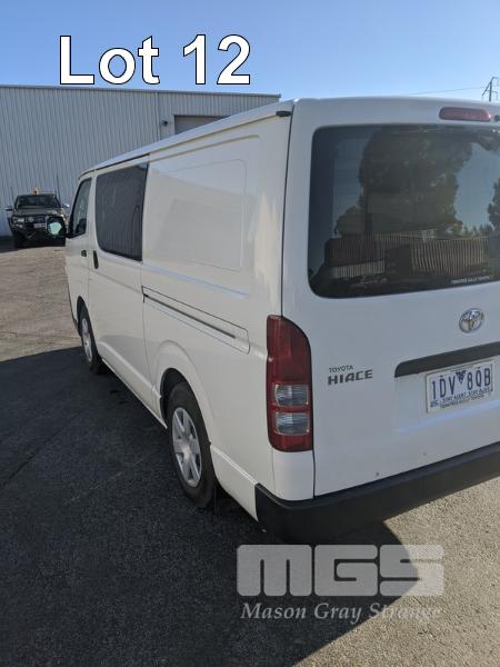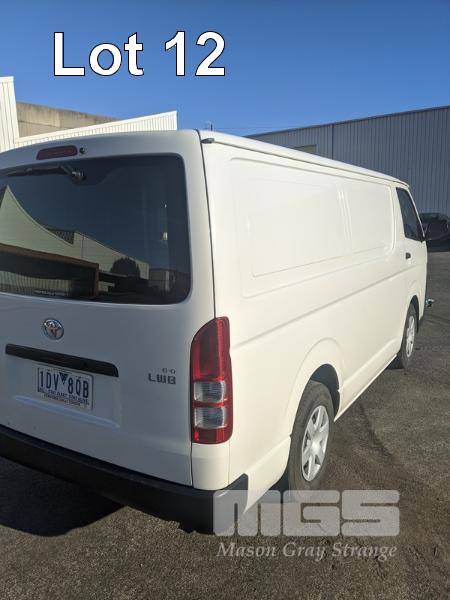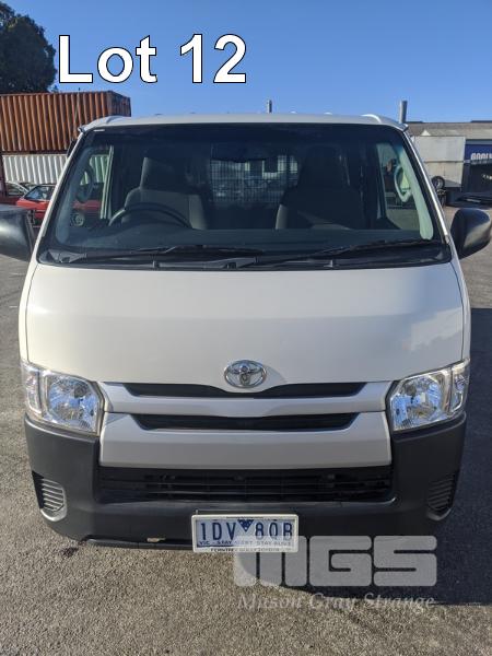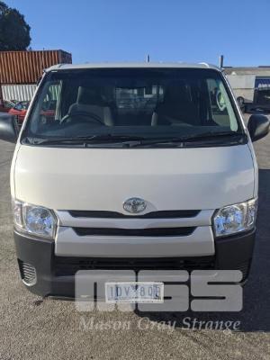2014 TOYOTA HIACE KDH201R-RBMDYQ 200 SERIES LWB VAN 6.0 REG: 1DV 8QB (VIC) VIN: JTFHT02P600159925 ENG: 1KD246444 ODO: 127,230kms SHOWING 3.0 LITRE, 4 CYLINDER, 5 SPEED MANUAL TRANSMISSION, TURBO DIESEL, WHITE DUCO, 2 DOORS, 2 SEAT, REAR WHEEL DRIVE AIR BAG, AIR CON, CARGO BARRIER, CD PLAYER, CENTRAL LOCKING, CRUISE CONTROL, IMMOBILISER, POWER STEERING, POWER WINDOWS, SHELVING, SPARE WHEEL, KEY #14 (NO PAPERS, WITH 1 KEY/S, WITH OWNER'S MANUAL, WITH SERVICE BOOKS)