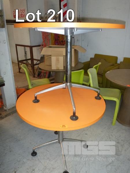 2 x ROUND TABLES, ORANGE TIMBER LAMINATE, 900mm DIAMETER, CHROME STEEL PEDESTAL BASE