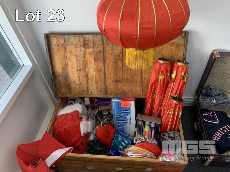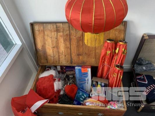 CONTENTS OF TRUNK COMPRISING XMAS LIGHTS & DECORATIONS, 14 x XMAS STOCKINGS, CHINESE LANTERNS, MINI DECORATIVE UMBRELLAS, SOLAR LANTERNS, BUD LIGHTS, DUMPLING SET & T2 TEA MAKER