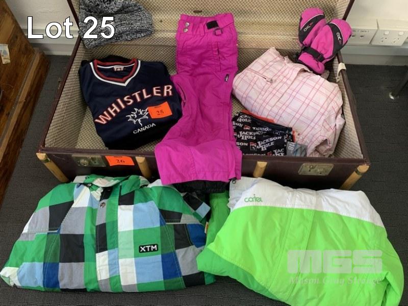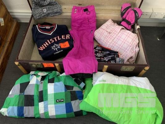 SKI CLOTHING COMPRISING XTM BOYS JACKET, SIZE 14, CARTEL GIRLS JACKET, SIZE 10, GIRLS PINK SKI PANTS, SIZE 10, GIRLS SURFANIC SKI JACKET, SIZE 8, 5 x ASSORTED T-SHIRTS & WINDCHEATERS, GLOVES & BEANIE