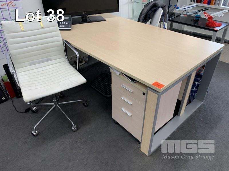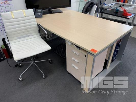 CONTEMPORARY OFFICE DESK, 180 x 105cm, BEECH VENEER WITH 3 DRAWER UNDERDESK MOBILE (SLIGHT DAMAGE) & MID BACK EAMES REPLICA, WHITE VINYL OFFICE CHAIR