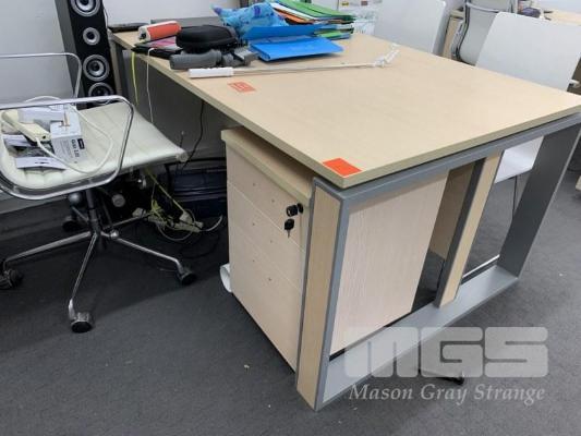 CONTEMPORARY OFFICE DESK, 150 x 105cm, BEECH VENEER WITH 3 DRAWER UNDERDESK MOBILE (LOCKED) & EXECUTIVE REPLICA EAMES OFFICE CHAIR, (WITH SPARE GAS LIFT)