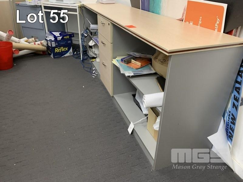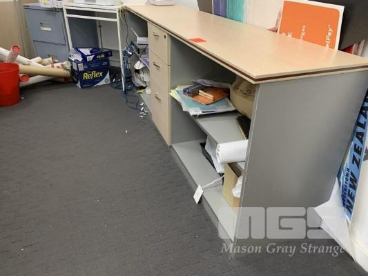 CREDENZA, 3 DRAWER, 200cm, BEECH LAMINATE, PRINTER STAND, FILING CABINET, 2 DRAWER & 7 x GLASS DOORS, 105 x 40cm