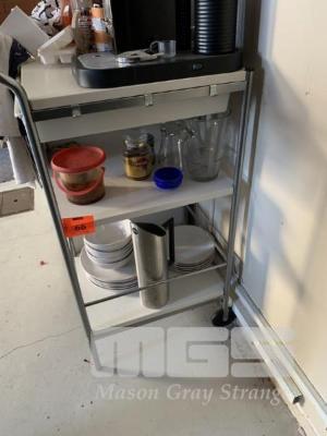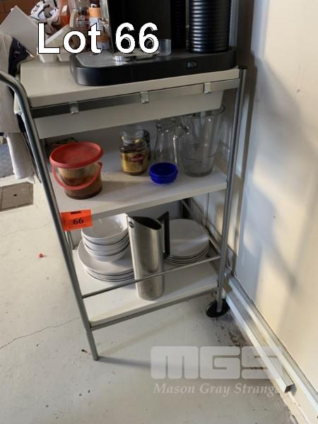 3 TIER SHELF, 2 x WHEELS, CUTLERY DRAWER & SUNDRY CROCKERY, ETC