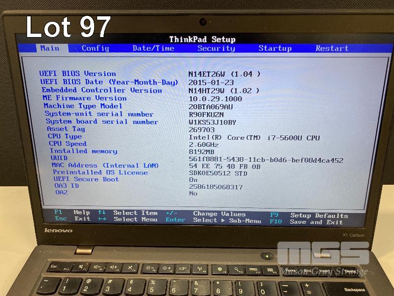 LAPTOP / ULTRABOOK, LENOVO THINKPAD X1 CARBON (20BTA069AU), CORE i7 5600U (5TH GEN) @ 2.6GHz, 8GB DDR3 RAM, 256GB SSD, 14" WIDESCREEN (1920x1080), INTEL HD VIDEO, Wi-Fi, BLUETOOTH, WINDOWS 10 HOME INSTALLED, ONELINK PRO DOCK & POWER SUPPLY S/N:R90FKUZN