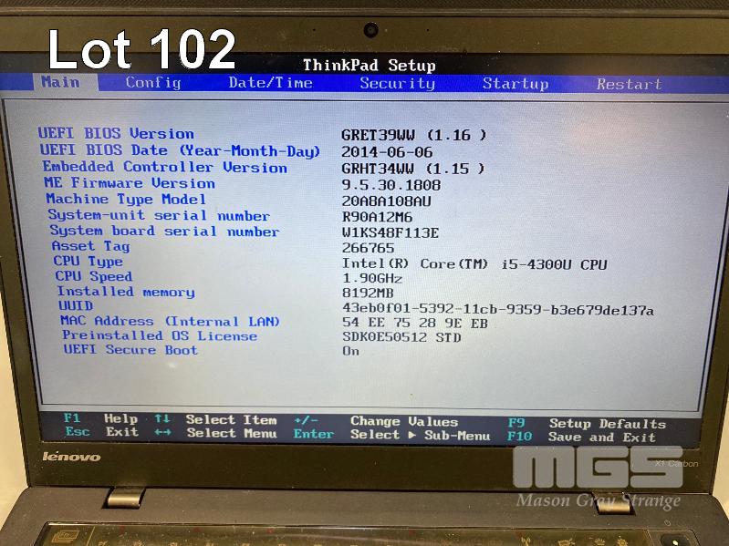 LAPTOP / ULTRABOOK, LENOVO THINKPAD X1 CARBON (20A8A108AU), CORE i5 4300U (4TH GEN) @ 1.9GHz, 8GB DDR3 RAM, 256GB SSD, 14" WIDESCREEN (1600x900), Wi-Fi, BLUETOOTH, WINDOWS 10 HOME INSTALLED, ONELINK PRO DOCK & POWER SUPPLY S/N:R90A12M6