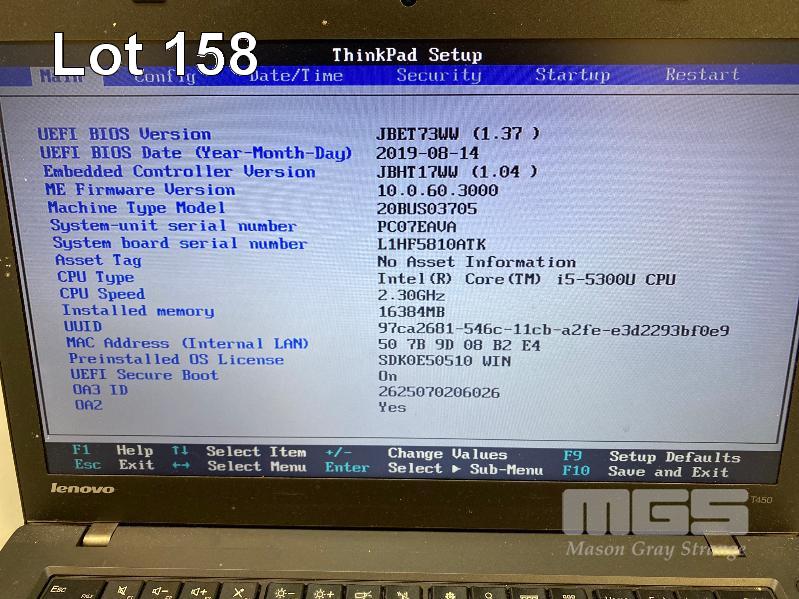 LAPTOP / ULTRABOOK, LENOVO THINKPAD T450 (20BUS03705), CORE i5 5300U (5TH GEN) @ 2.3GHz, 16GB DDR3 RAM, 250GB SSD, 14" WIDESCREEN (1366x768), INTEL HD VIDEO, Wi-Fi, BLUETOOTH, WINDOWS 10 PRO INSTALLED & POWER SUPPLY S/N:PC07EAVA