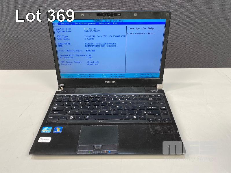 LAPTOP, TOSHIBA PORTEGE R830 (PT321A-01K00201), CORE i5 2520M (2ND GEN) @ 2.5GHz, 4GB DDR3 RAM, 500GB SATA HDD, DVD-RW, 13.3" WIDESCREEN & POWER SUPPLY (NOTE: HARD DRIVE FAULTY, MISSING LEFT SCREEN HINGE COVER) S/N:8B116017H