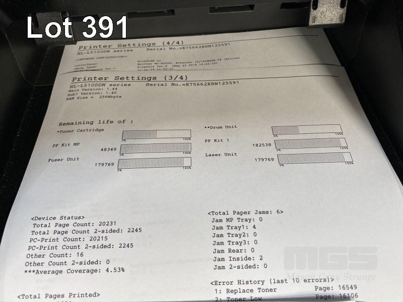 PRINTER, BROTHER HL-L5100DN LASER, USB, NETWORK, 20,236 PAGES (TEST PAGE ATTACHED)
