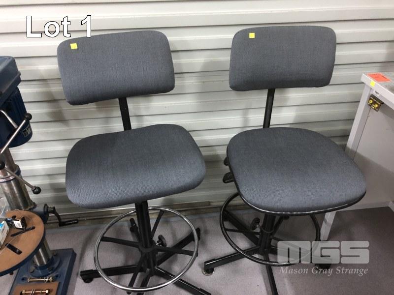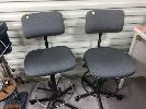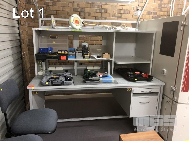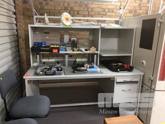 STEEL FRAME WORK BENCH, GREY LAMINATE, SHELVING HUTCH, STATIC GROUNDING 6 x DOUBLE 240V OUTLETS OVERHEAD FLURO LIGHTING SINGLE DRAWER WITH SLIDE OUT WORK PLATFORM 180 x 100 x 218cm (H) & 2 x STOOLS