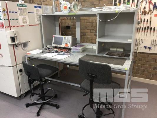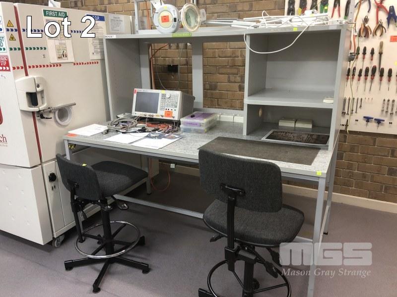 STEEL FRAME WORK BENCH, GREY LAMINATE, SHELVING HUTCH, STATIC GROUNDING 8 x DOUBLE 240V OUTLETS OVERHEAD FLURO LIGHTING 180 x 100 x 218cm (H) & 2 x STOOLS