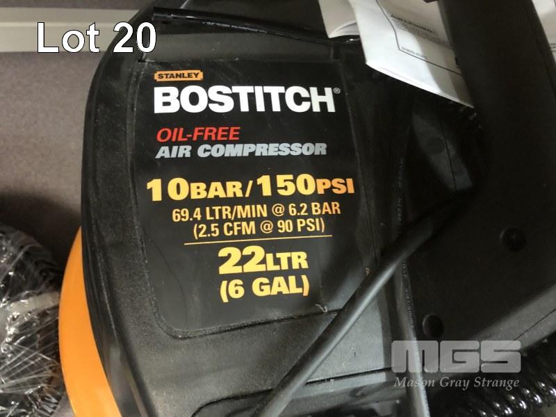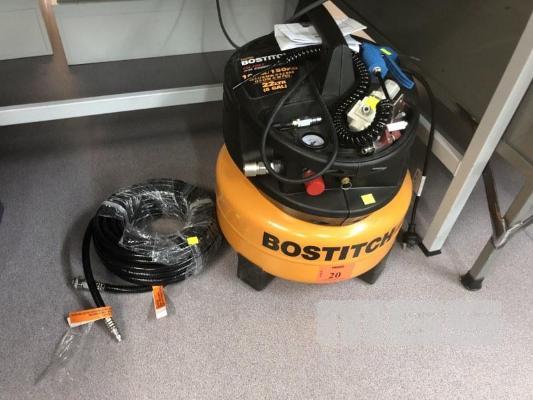 AIR COMPRESSOR, BOSTITCH MOD: BTFP02000 10 BAR/150PSI 69.4 LITRE/MINUTE AT 6.2 BAR 240V WITH REGULATOR, AIR GUN, AIR HOSE & MANUAL