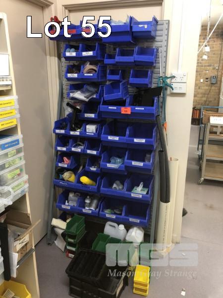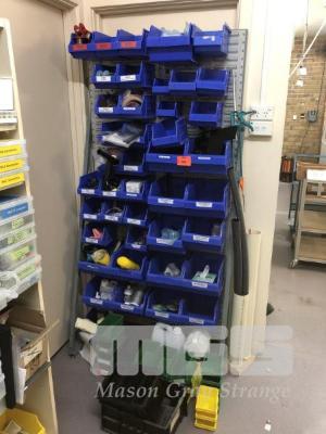 STORAGE BIN RACK WITH BINS & CONTENTS, HEAT SHRINK, FLUX SOLVENTS, SANDPAPER, SEALANTS & SPARE BINS