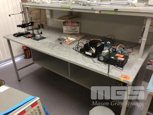 STEEL FRAME WORK BENCH, STATIC GROUNDING 10 x DOUBLE 240V OUTLETS BOTTOM & TOP SHELF UNIT OVERHEAD LIGHTING, 200 x 97 x 210cm (H)