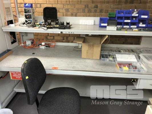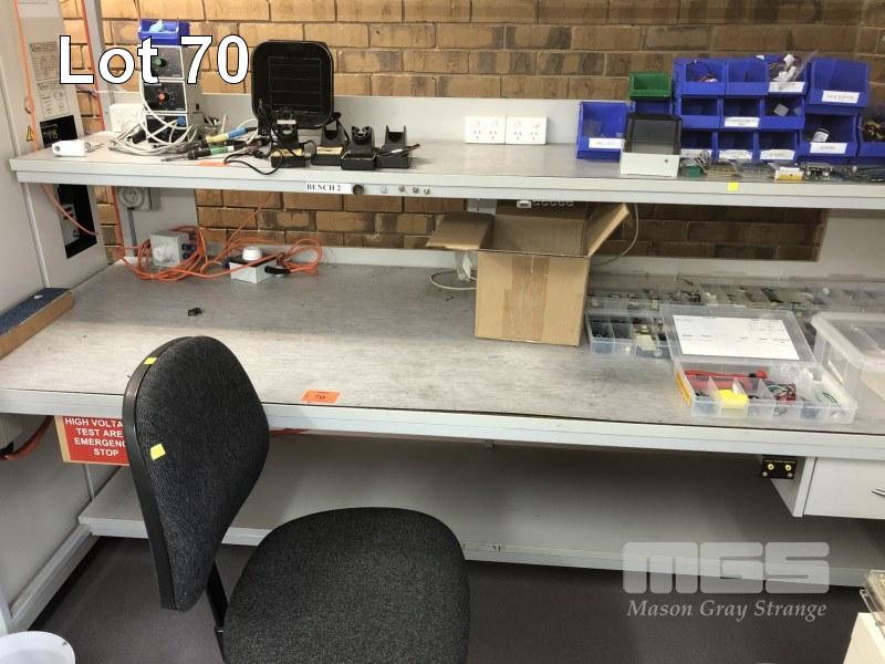 STEEL FRAME WORK BENCH, SINGLE DRAWER, STATIC GROUNDING 10 x DOUBLE 240V OUTLETS BOTTOM & TOP SHELF UNITS OVERHEAD LIGHTING, HIGH VOLTAGE EMERGENCY STOP 240 x 97 x 210cm (H) & 1 x STOOL