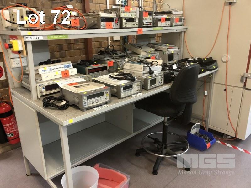 STEEL FRAME WORK BENCH, GREY TIMBER LAMINATE, STATIC GROUNDING 10 x DOUBLE 240V OUTLETS BOTTOM & TOP SHELF UNITS OVERHEAD LIGHTING, 240V 200 x 97 x 230cm (H) & 1 x STOOL