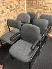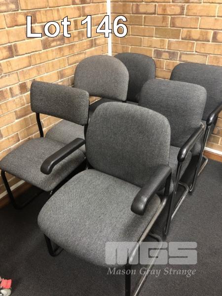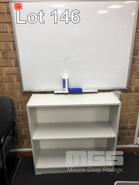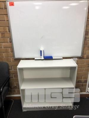 WHITEBOARD, 1200 x 900mm & LOWLINE GREY LAMINATE SHELF UNIT WITH 6 x VARIOUS STEEL FRAMED CLOTH VISITORS CHAIRS