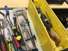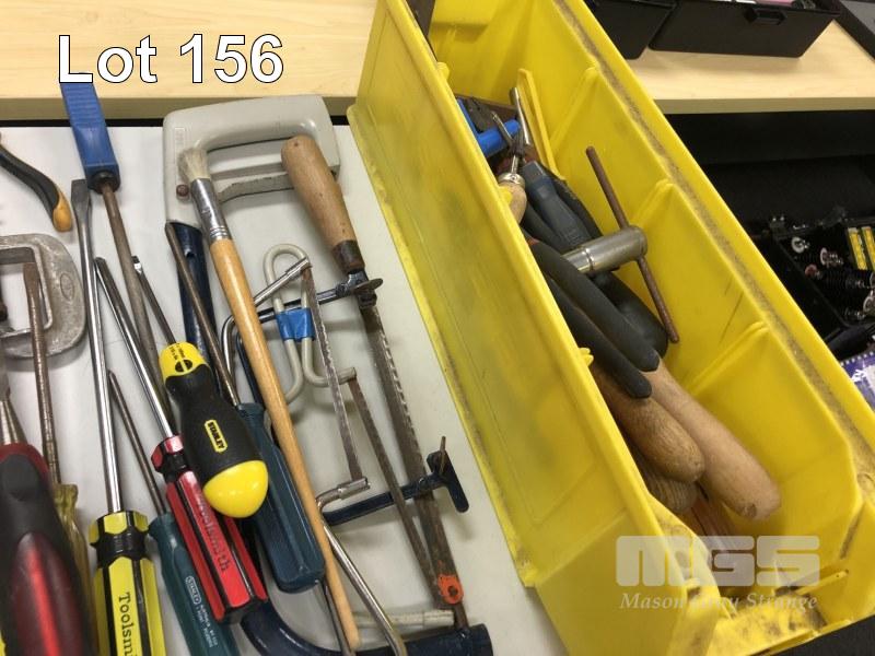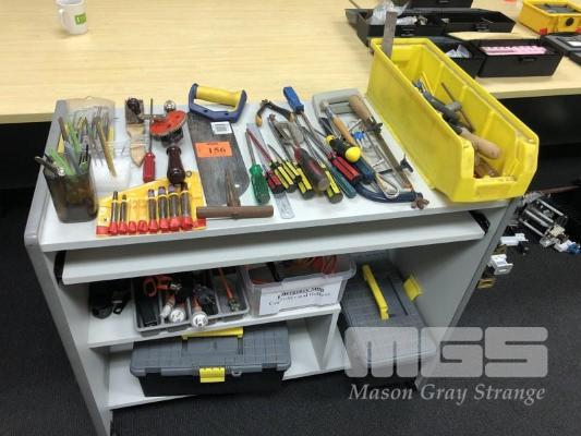 ASSORTED HAND TOOLS, SCREWDRIVERS, PUNCHER, SAWS, TOOL BOXES, FILES, HAND DRILL, ELECTRICAL LEADS ON TROLLEY