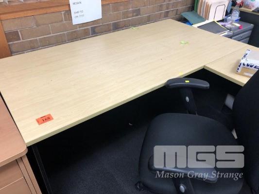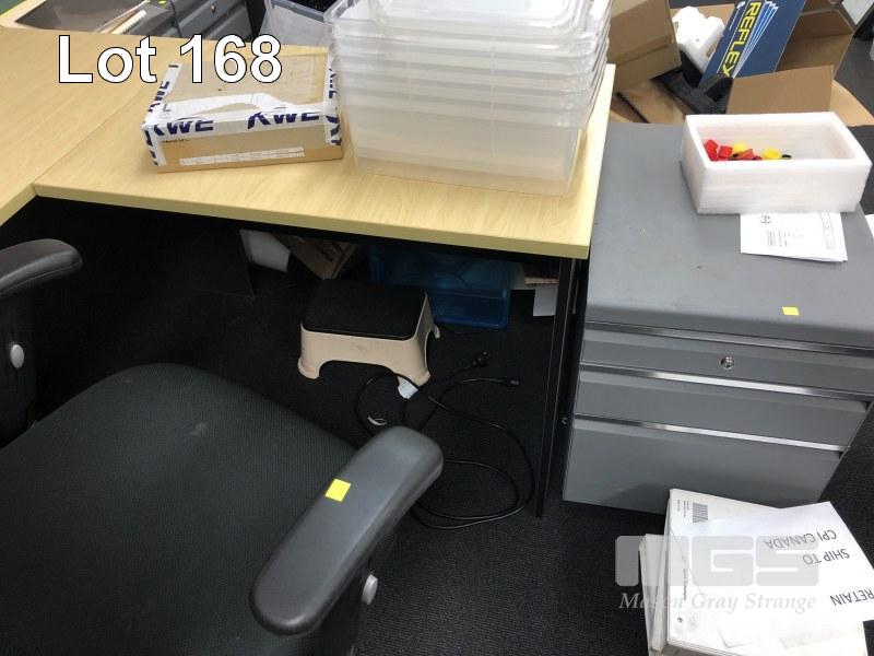 DESK WITH RETURN, 2 TONE BEECH/STORM LAMINATE, 180 x 80cm, GAS LIFT OFFICE CHAIR, BLACK FABRIC & GREY STEEL UNDERDESK MOBILE