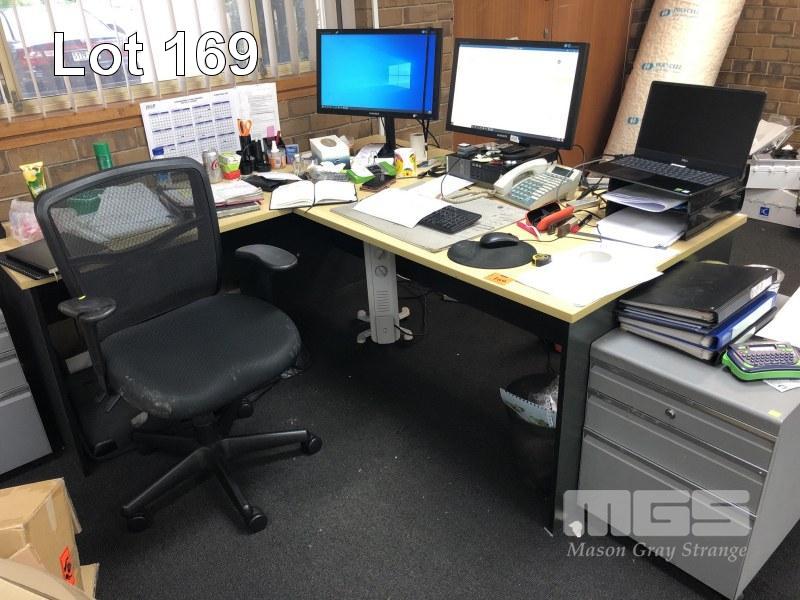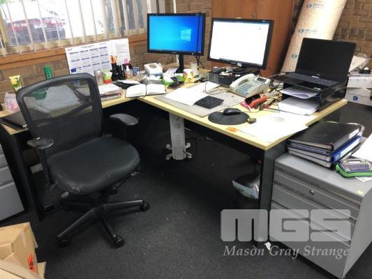 DESK WITH RETURN, 2 TONE BEECH/STORM LAMINATE, 180 x 80cm, GAS LIFT OFFICE CHAIR, BLACK FABRIC & GREY STEEL UNDERDESK MOBILE