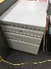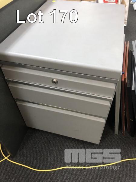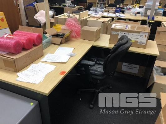 DESK WITH RETURN, 2 TONE BEECH/STORM LAMINATE, 180 x 80cm, GAS LIFT OFFICE CHAIR, BLACK FABRIC (FABRIC TORN) & GREY STEEL UNDERDESK MOBILE