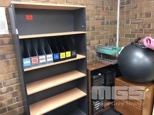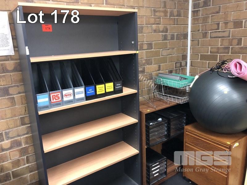 2 TONE TIMBER LAMINATE BOOKSHELF, 5 TIER, 90 x 29 x 180cm (H) WITH TIMBER LAMINATE UNDERDESK MOBILE & TIMBER LAMINATE LOWLINE BOOKSHELF