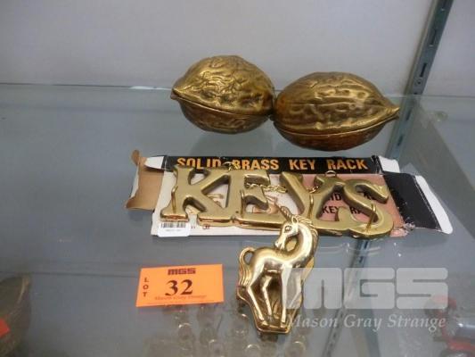 PAIR OF BRASS WALNUT CRACKERS, KEY RACK & UNICORN CLIPS