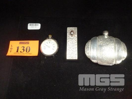 SILVER POCKET WATCH MARKED 935, SILVER LIPSTICK CASE MARKED 800 & SILVER HALLMARKED ORNATE HIP FLASK
